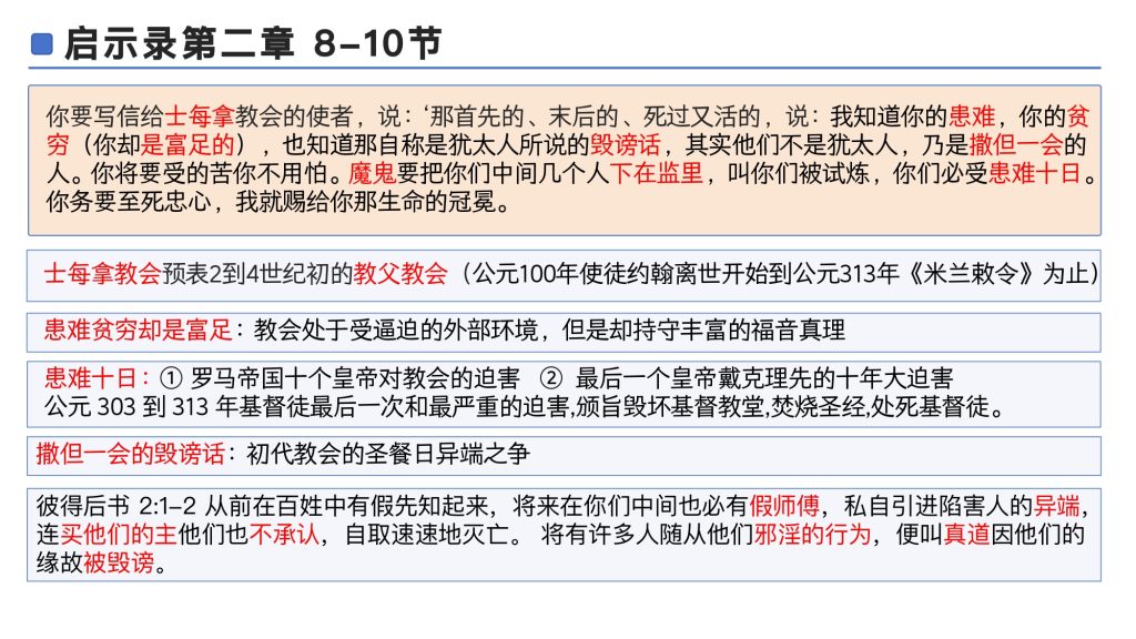 9节开头写到,我知道你的患难,你的贫穷,你却是富足的,这是预言教会处于受逼迫的外部环境,但持守的福音真理却是富足的。10节中“魔鬼要把你们中间几个人下在监里,你们必受患难十日”,是在预言罗马帝国十个皇帝对教会的迫害 ,尤其是最后一个皇帝戴克理先的十年大迫害,从公元 303 到 313 年,基督徒最后一次和最严重的迫害,颁旨毁坏基督教堂,焚烧圣经,处死基督徒。