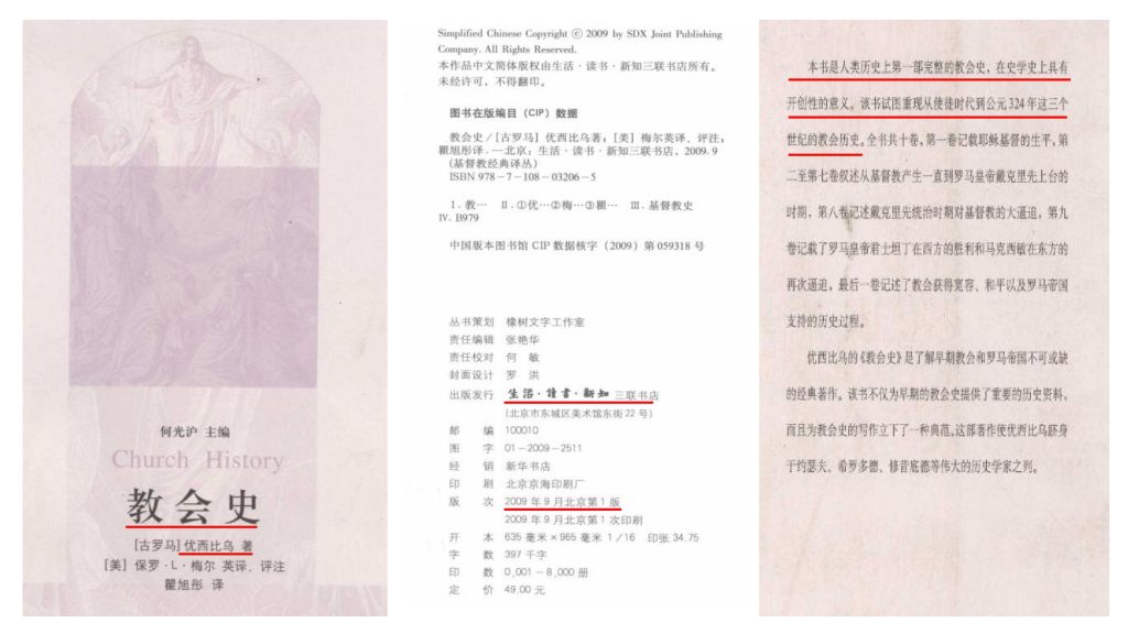 关于初代教会历史,最重要的史料就是优西比乌著的《教会史》一书。这本书是人类历史上第一部完整的教会史,重现了使徒时代到公元324年这三个世纪的教会历史。我们参考的版本是2009年三联书店出版的中文翻译版。这本书在孔夫子旧书网可以买到。