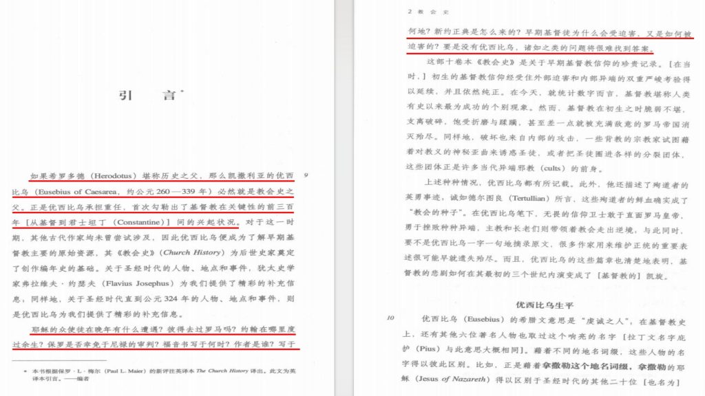 书中的引言记录了作者凯撒利亚的优西比乌的生平年代,约公元260年到339年,也提到了使徒晚年的遭遇,特别提到了彼得、约翰和保罗的晚年遭遇和结局,福音书的作者和年代,新约正典的形成,还有早期基督徒受到的迫害。