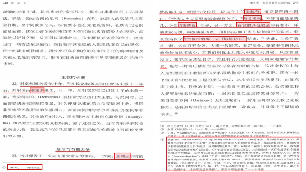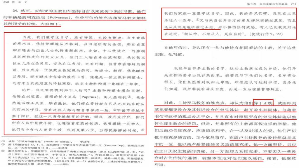 248页和249页,详细记录了一场标题为复活节节期之争的争论,这场争论就发生在公元一世纪末,维克多担任罗马主教的时期。我们读一下相关的划红线的记录。
