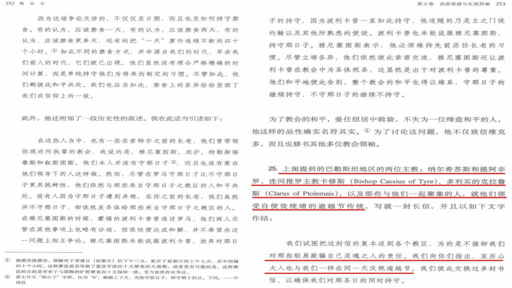 我再读一下249页下边的注释4,根据http: //ekklesiahistory. ftt org. tw/big5/book05/chapter23. htm的译注,此问题的症结在于:基督徒当在何日守复活节圣餐?亚细亚教会以犹太人的逾越节为基点,强调基督的死,其他教会以相传基督复活之日为基点,强调基督的复活。这一问题早已存在于东西方教会之间。西方教会的观点后来逐渐被广泛接受。325年尼西亚会议正式宣告,大公教会统一实行在复活日守逾越节/复活节的做法,定罪并且废止亚细亚教会迁就犹太教的习惯。少数不配合的人士,被称为”Quartodecimanians”. 意即“守第十四日者”。但是,关于基督复活的具体日期,学术界并没有准确并一致的看法。