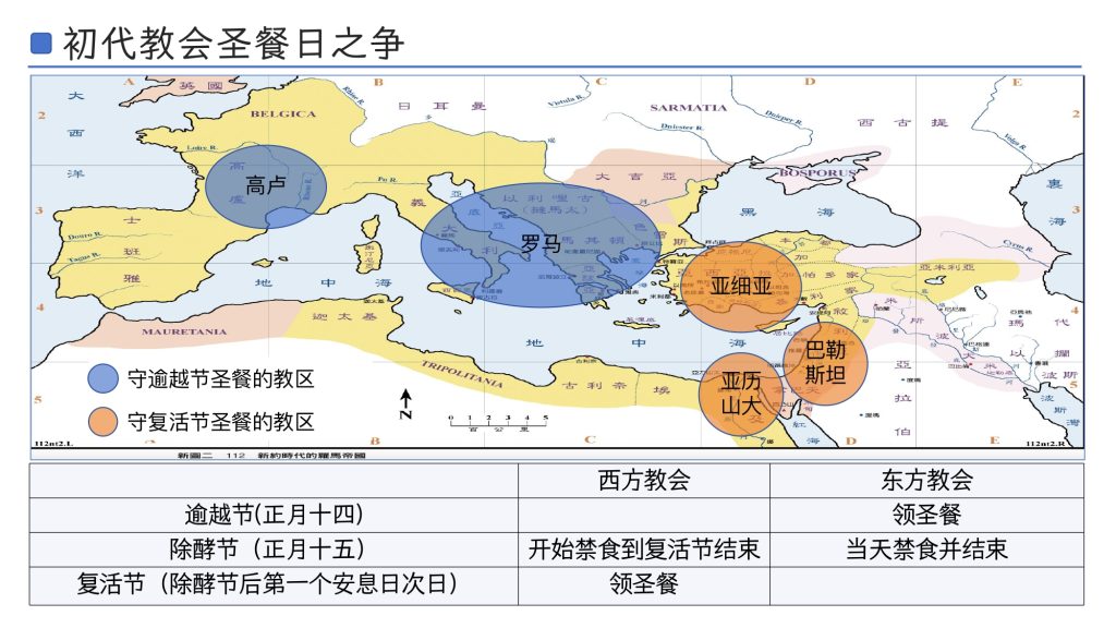 当时在西部罗马教会的教父,坚持在星期日复活节领圣餐,而在东部小亚西亚地区的教会,在逾越节领圣餐,双方都自称是继承了使徒的传统。关于这段纷争的历史,我们必须通过查考圣经之外的史料来了解。