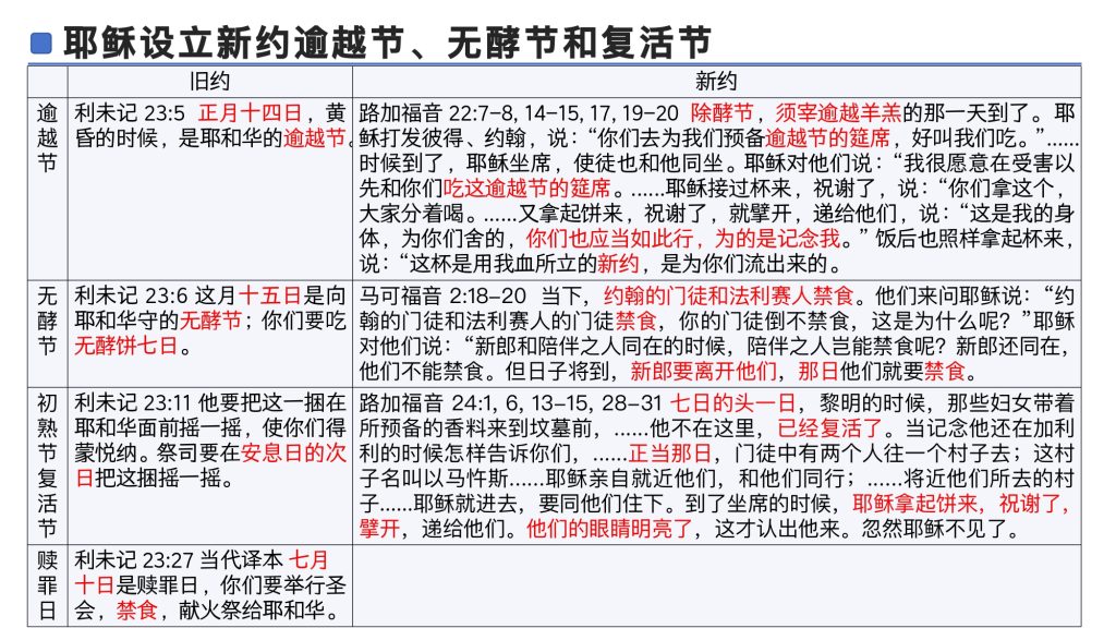 这段圣经中讲到约翰的门徒和法利赛人禁食。旧约中唯一规定禁食的节期,就是七月十日的赎罪日。耶稣却说,新郎离开的日子,陪伴之人要禁食,这是设立新约的禁食节期,是指他被钉十字架的日子,对应了旧约正月十五的除酵节,所以新约除酵节要禁食一天,用来纪念耶稣的受难。