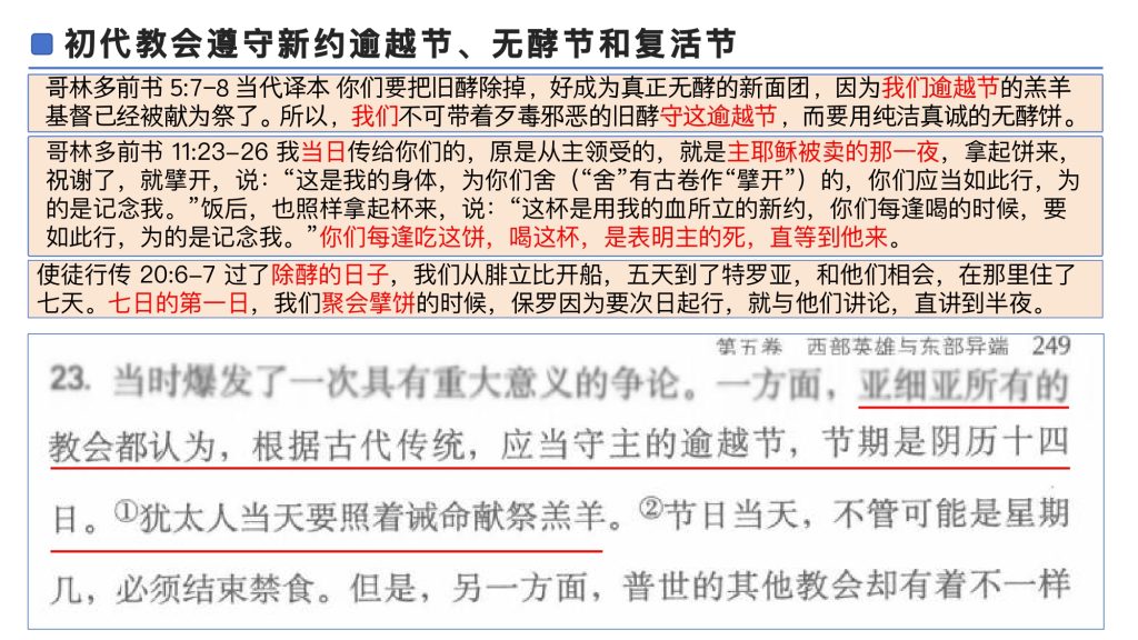 我们再解释一下这段注释,这个注释总结了这场节期之争的核心,就是圣餐日到底是在哪一天?亚细亚东方教会在犹太人的逾越节领圣餐,强调基督的死,西方的罗马教会再复活节星期日领圣餐,强调基督的复活。