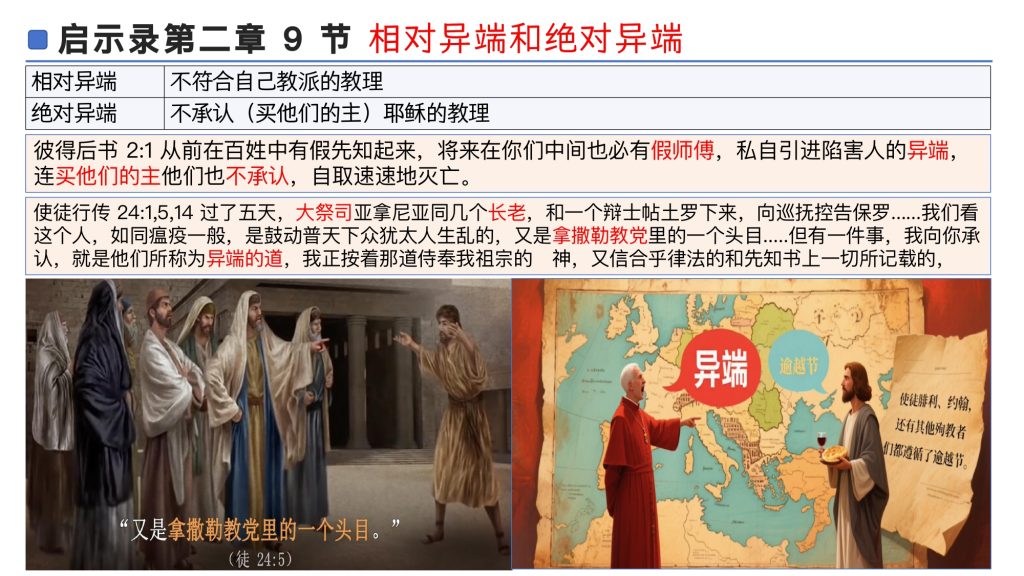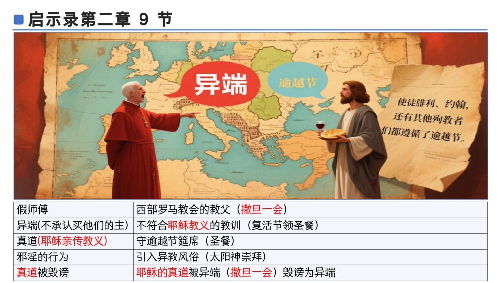 我们再看启示录二章九节中预言的说毁谤话撒旦一会,和彼得后书中预言的假师傅,就是指西部罗马教会的教父群体,他们引入星期日复活节圣餐的异端,却反过来毁谤遵守耶稣真道,逾越节圣餐的东部小亚细亚教会为异端。