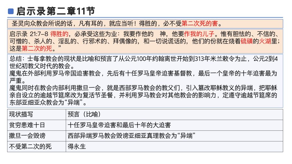 最后我们总结士每拿教会的书信,士每拿教会的现状是比喻和预言了从公元100年约翰离世开始到313年米兰敕令为止,公元2到4世纪初教父时代的教会。