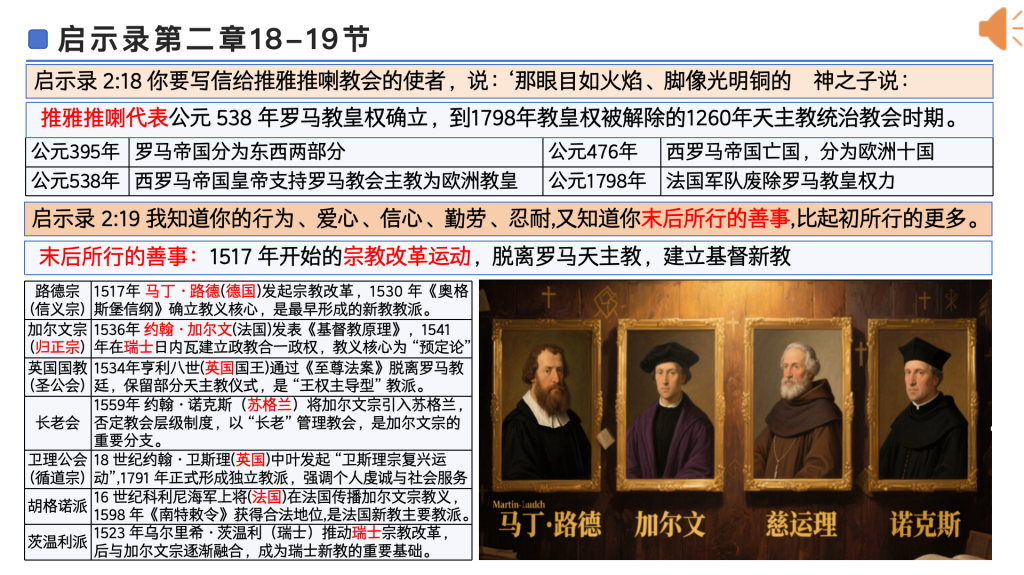 最后我们总结一下:推雅推喇的现状是比喻和预言了从公元538年教皇权确立到1798年教皇失权,罗马天主教1260年掌权的历史。天主教继承了罗马国教的太阳神崇拜风俗和教义,又引入玛丽亚、十字架和圣徒崇拜、炼狱说等异教教义,最终引发1517年的马丁路德宗教改革,产生了基督新教。新教恢复了因信称义的片面真理,但仍继承了天主教的异教崇拜仪式,仍需等待再临耶稣来恢复行为得救的新约真理。