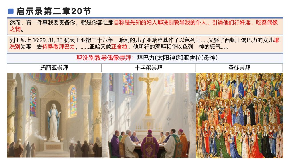 以上这些罗马天主教偶像崇拜仪式和教义的引入,正式应验了推雅推喇耶洗别教训行奸淫祭偶像的预言。