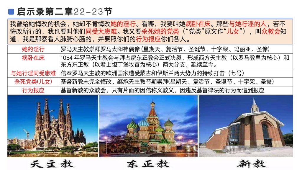 杀死党类和儿女,则是针对基督新教的外在仪式而言。基督新教虽然经过宗教改革,但是并未完全恢复真理,仍然继承了罗马天主教的节期崇拜仪式,保留了星期天、复活节、圣诞节、十字架、圣餐礼等仪式,所以被称为天主教的党类或儿女。他们要被杀死,是指基督新教的灵性仍属于死亡的状态。