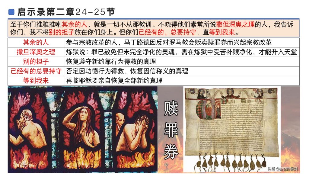 撒但深奥之理,是指罗马天主教引入的炼狱说教义,炼狱说宣称罪已赦免但未完全净化的灵魂,需在炼狱中受苦补赎净化,才能升入天堂。以炼狱说为教义基础,罗马教廷贩卖赎罪券,宣称购买赎罪券可以为炼狱中的人减轻痛苦。1517年马丁路德因反对罗马教会贩卖赎罪券而兴起宗教改革。