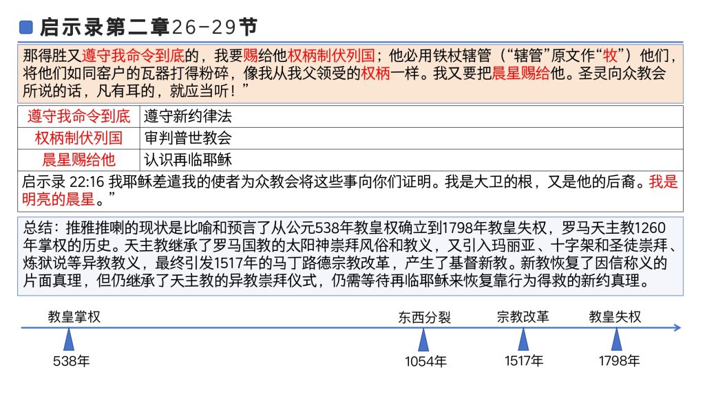 遵守我命令到底,这是针对罗马天主教中的宗教改革者来说,要继续跟随再临耶稣完成的宗教改革,遵守再临耶稣恢复的新约律法。赐权柄制伏列国,则是审判普世教会的意思。