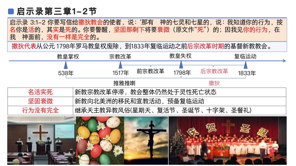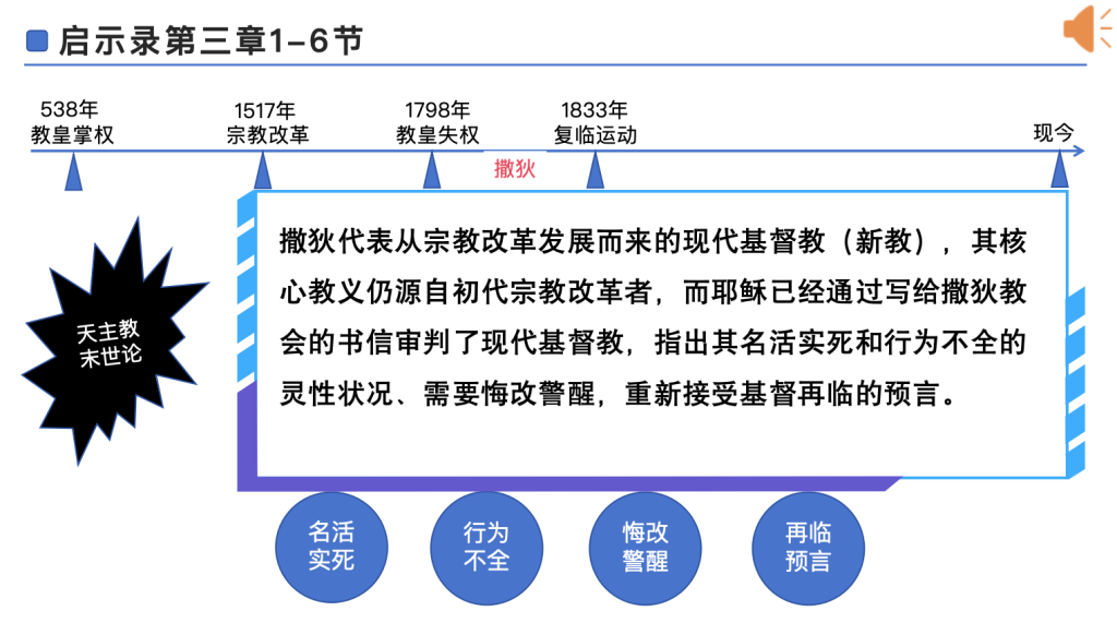 耶稣借着写给撒狄教会的书信,其预言的历史事件集中指向1798到1833年这段时期,但是对教会的警告和劝勉,则是指向当代的基督教会。