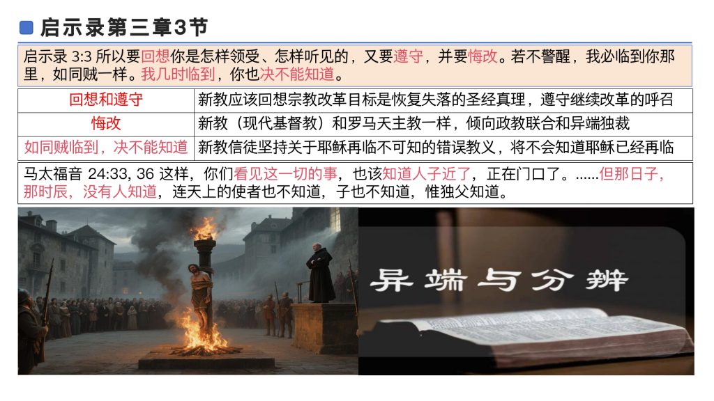 3节后半段说,若不警醒,我必临到你那里,如同贼一样。我几时临到,你也决不能知道。 这是对新教坚持异端独裁的后果的警告,就是不会知道耶稣已经再临。这也是现代基督教会持有的固有错误观念。